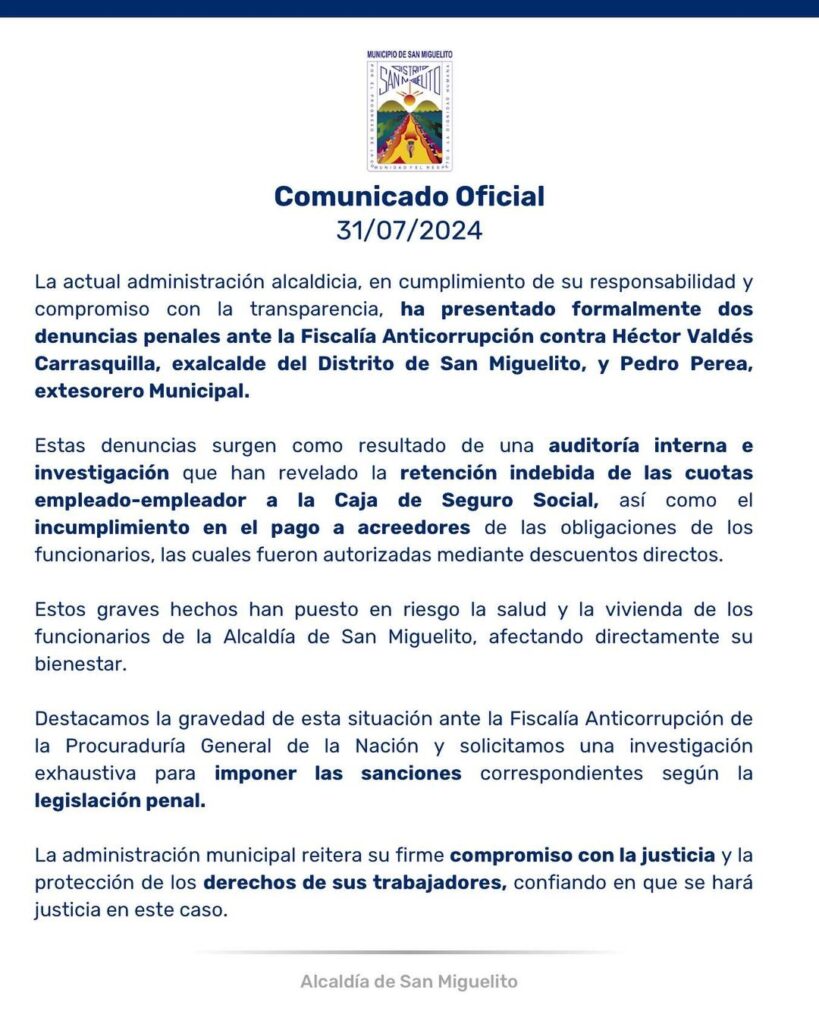 La alcaldesa de San Miguelito, Irma Hernández, comunicó que este 31 de julio se presentaron dos denuncias penales ante la Fiscalía Anticorrupción contra el exalcalde Héctor Valdés Carrasquilla y Pedro Perea, extesorero municipal.