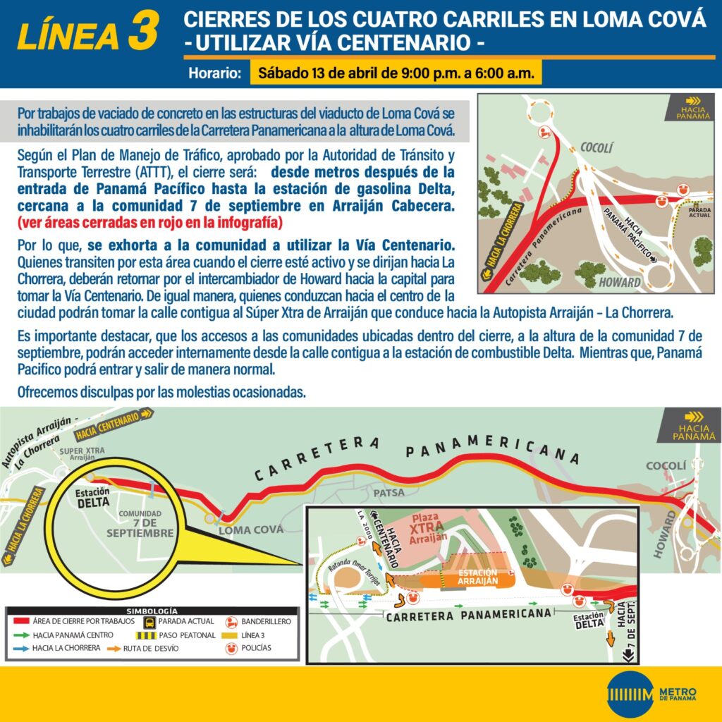 Este sábado 13 de abril los cuatro carriles de Loma Cová estarán cerrados, por lo que se recomienda usar el Centenario, informó el Metro de Panamá.