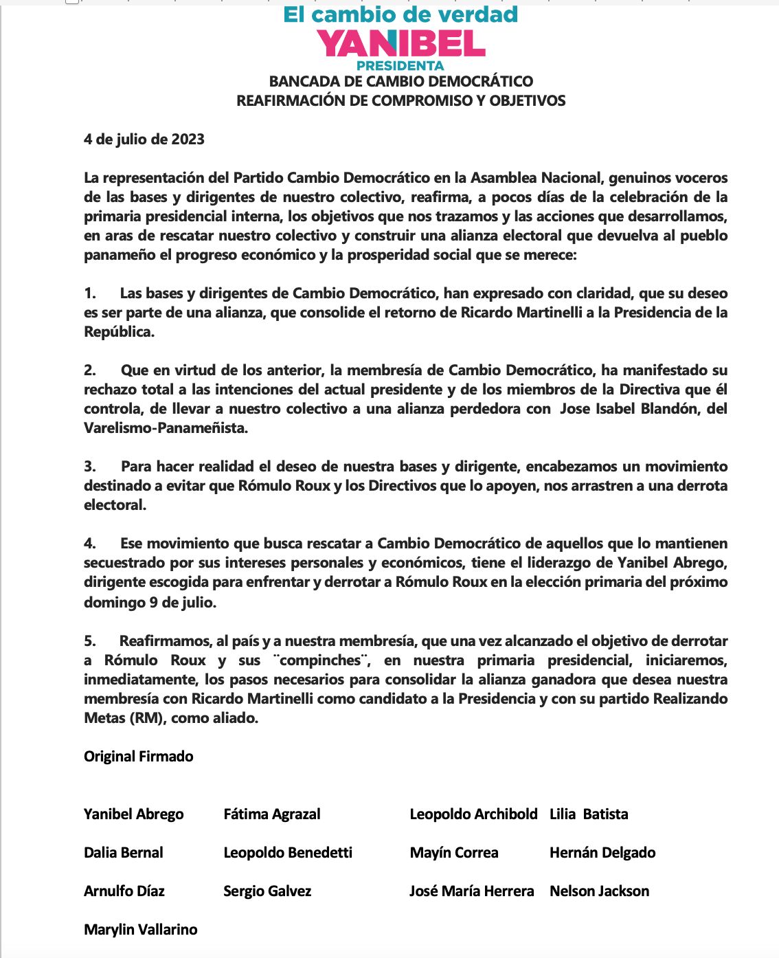 4. Ese movimiento que busca rescatar a Cambio Democrático de aquellos que lo mantienen secuestrado por sus intereses personales y económicos, tiene el liderazgo de Yanibel Abrego, dirigente escogida para enfrentar y derrotar a Rómulo Roux en la elección primaria del próximo domingo 9 de julio.