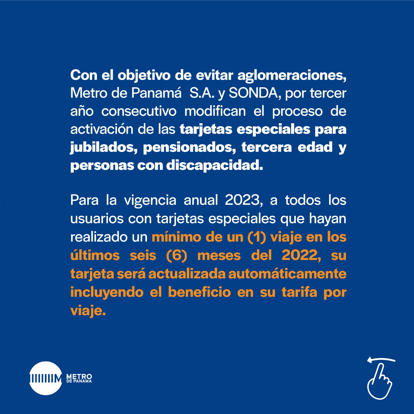 Con el objetivo de evitar aglomeraciones, Metro de Panamá, S.A. y SONDA, por tercer año consecutivo modifican el proceso de activación de las tarjetas especiales para jubilados, pensionados, tercera edad y personas con discapacidad.