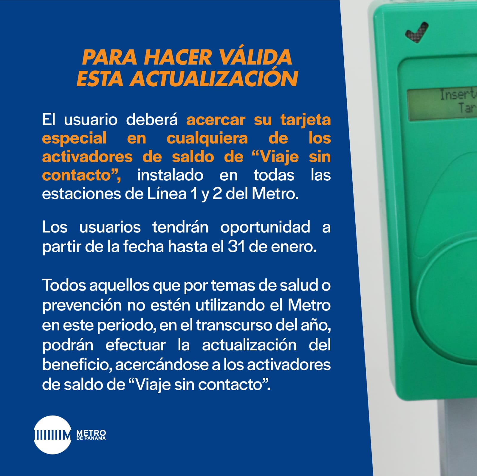 Para hacer válida esta actualización, los usuarios tendrán oportunidad a partir de la fecha hasta el 31 de enero. Todos aquellos que por temas de salud o prevención no estén utilizando el Metro en este periodo, en el transcurso del año, podrán efectuar la actualización del beneficio, acercándose a los activadores de saldo de “Viaje sin contacto”.