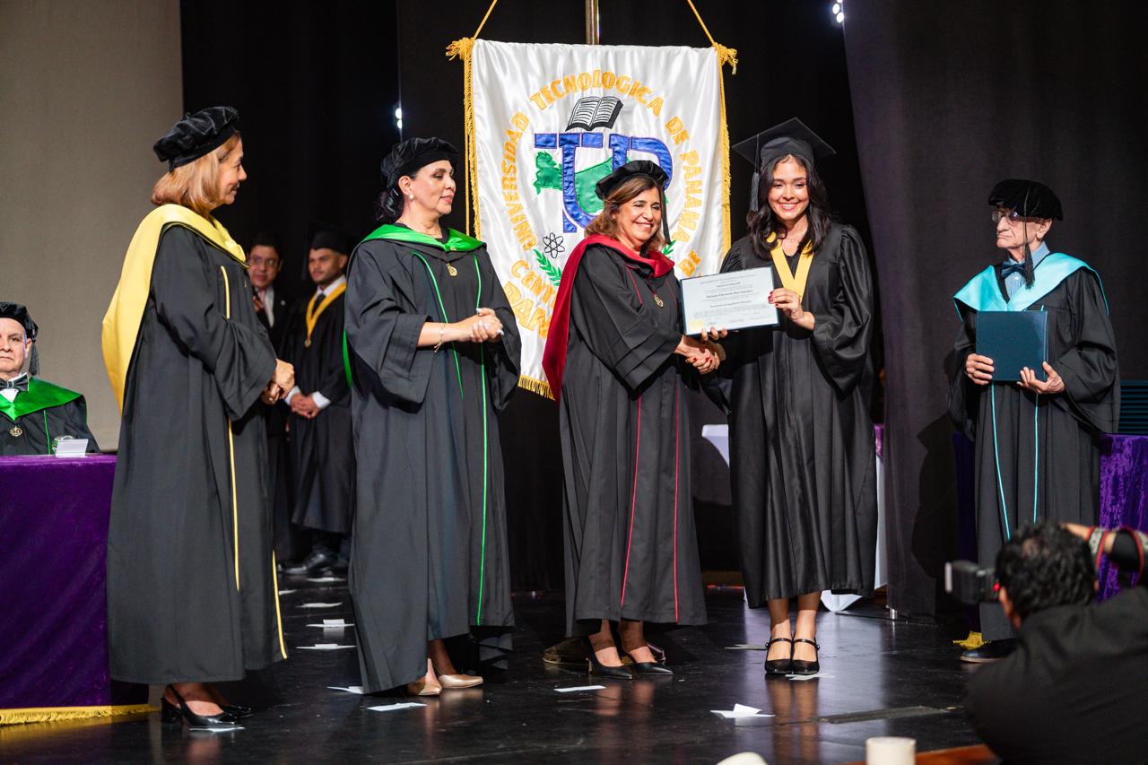 La Dra. Mirtha Moore, Vicerrectora Académica de la UTP, en representación de la Rectora de la UTP, expresó: “Hoy celebramos, precisamente, una victoria personal que es, al mismo tiempo, el triunfo colectivo de personas unidas por el afecto, por el cuidado, por el amor. Pero tal logro, va más allá de cada uno de los que recibirán el tan anhelado diploma y de sus seres queridos, también trasciende y llega a otro círculo mucho más amplio… Cultiven ideales que los lleven a nuevos rumbos, a alcanzar nuevas metas, y esfuércense para que su nación también alcance esos logros.”