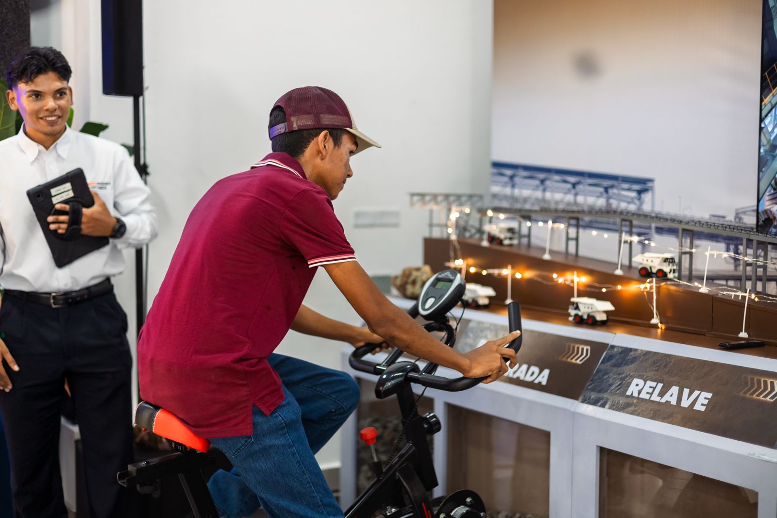 Una de las experiencias más llamativas es una bicicleta que permite generar energía al pedalear. Esta acción simple ayuda a entender, de forma directa, cómo funciona el sistema trolley y cómo la energía se transforma en movimiento dentro de la operación minera.