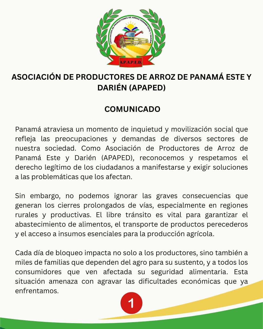 Panamá, 12 de mayo de 2025 – En medio del clima de movilización social que atraviesa el país, la Asociación de Productores de Arroz de Panamá Este y Darién (APAPED) ha emitido un llamado urgente a la reflexión y al diálogo nacional, ante el impacto que los cierres prolongados de vías están generando en las regiones rurales y productivas del país.