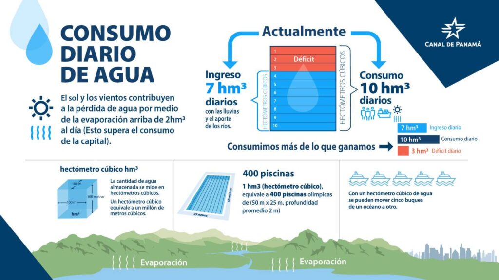 Para ponerlo en perspectiva: Tres hectómetros cúbicos equivalen al agua almacenada en 1,200 piscinas olímpicas, y este déficit diario ha originado que el embalse Gatún se encuentre siete pies por debajo del nivel esperado para la fecha, lo que representa el nivel más bajo registrado durante una temporada lluviosa en toda la historia de este reservorio.