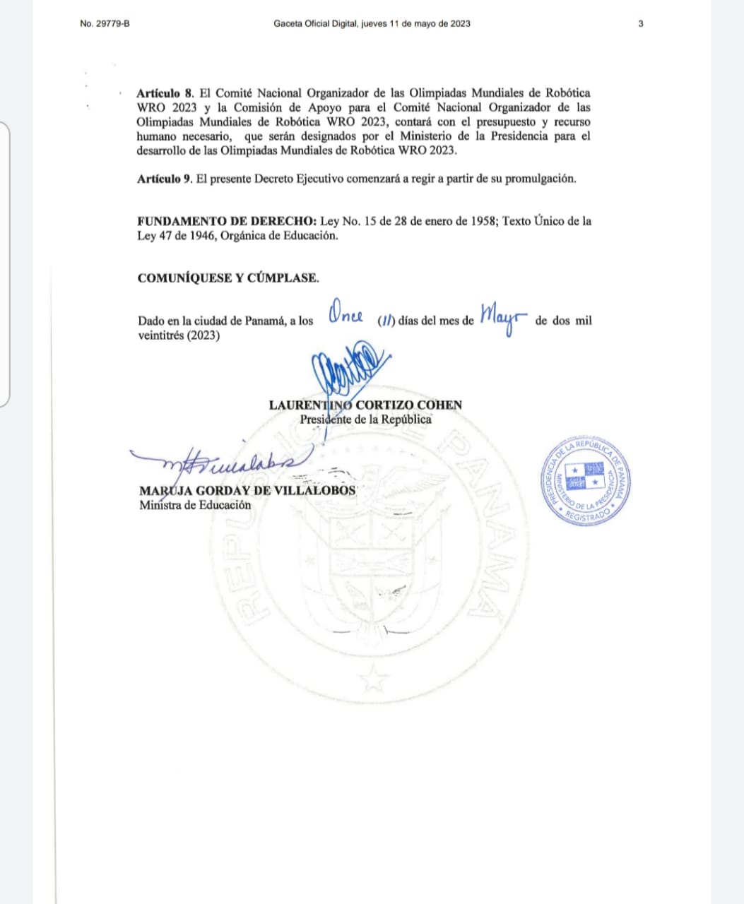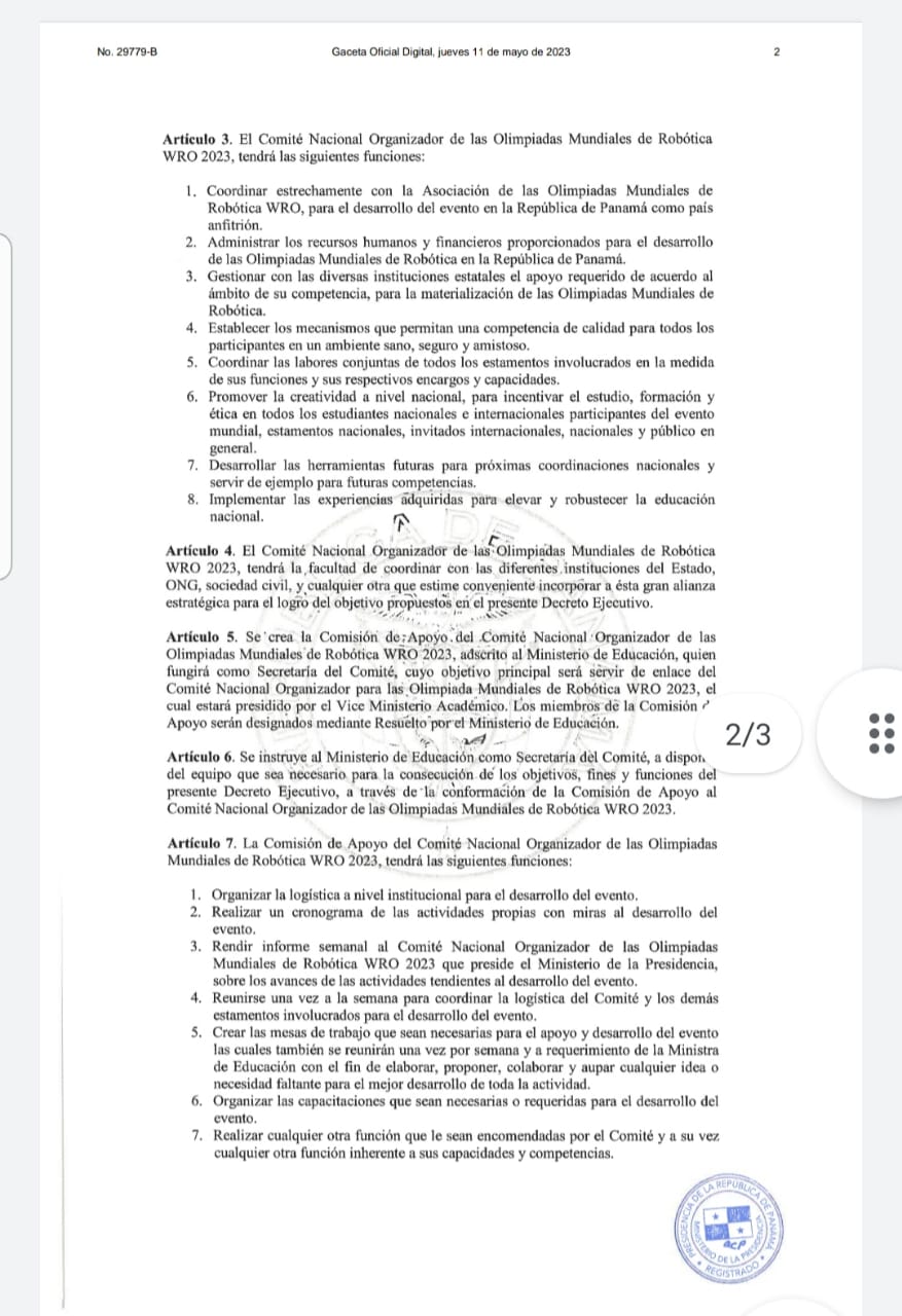 El Gobierno Nacional publicó hoy el Decreto Ejecutivo No. 23, del 11 de mayo de 2023, «Que crea el Comité Nacional Organizador de las Olimpiada Mundiales de Robótica WRO 2023 y la Comisión de Apoyo para el Comité Nacional Organizador de las Olimpiadas Mundiales de Robótica WRO 2023».