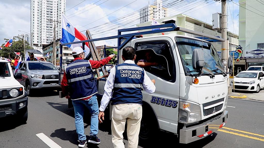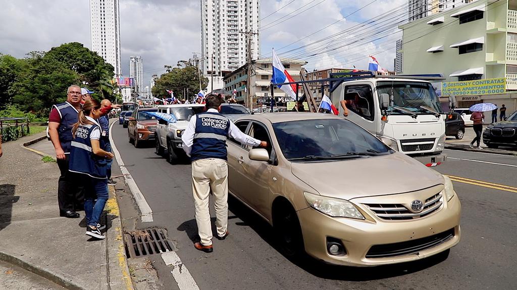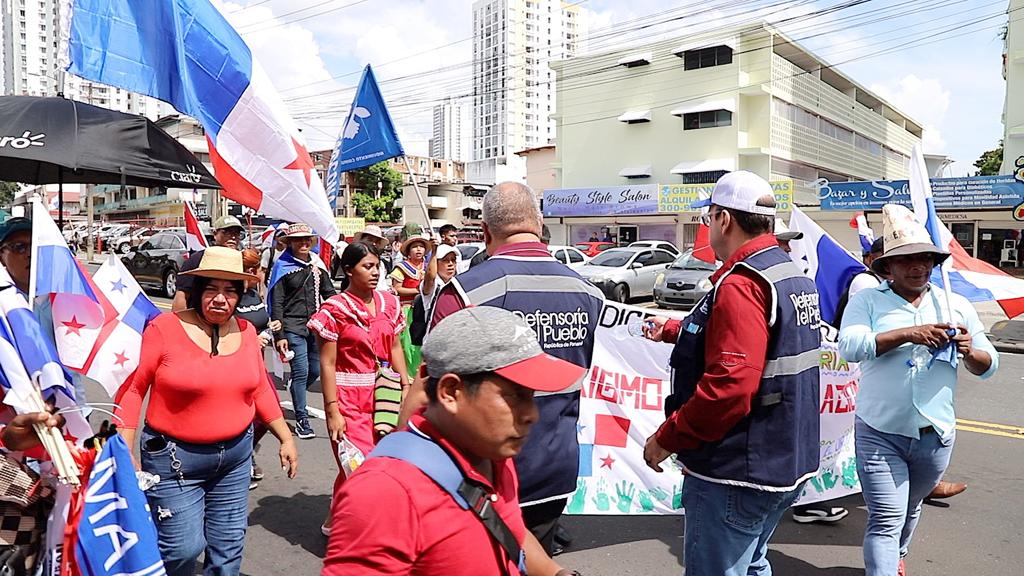 Oficiales de derechos humanos asistieron con hidratación a los manifestantes de una marcha al pasar frente de la Defensoría del Pueblo, la cual partió desde el corregimiento de la 24 de diciembre en protesta por el contrato minero, quienes se dirigen a la Corte Suprema de Justicia (CSJ).