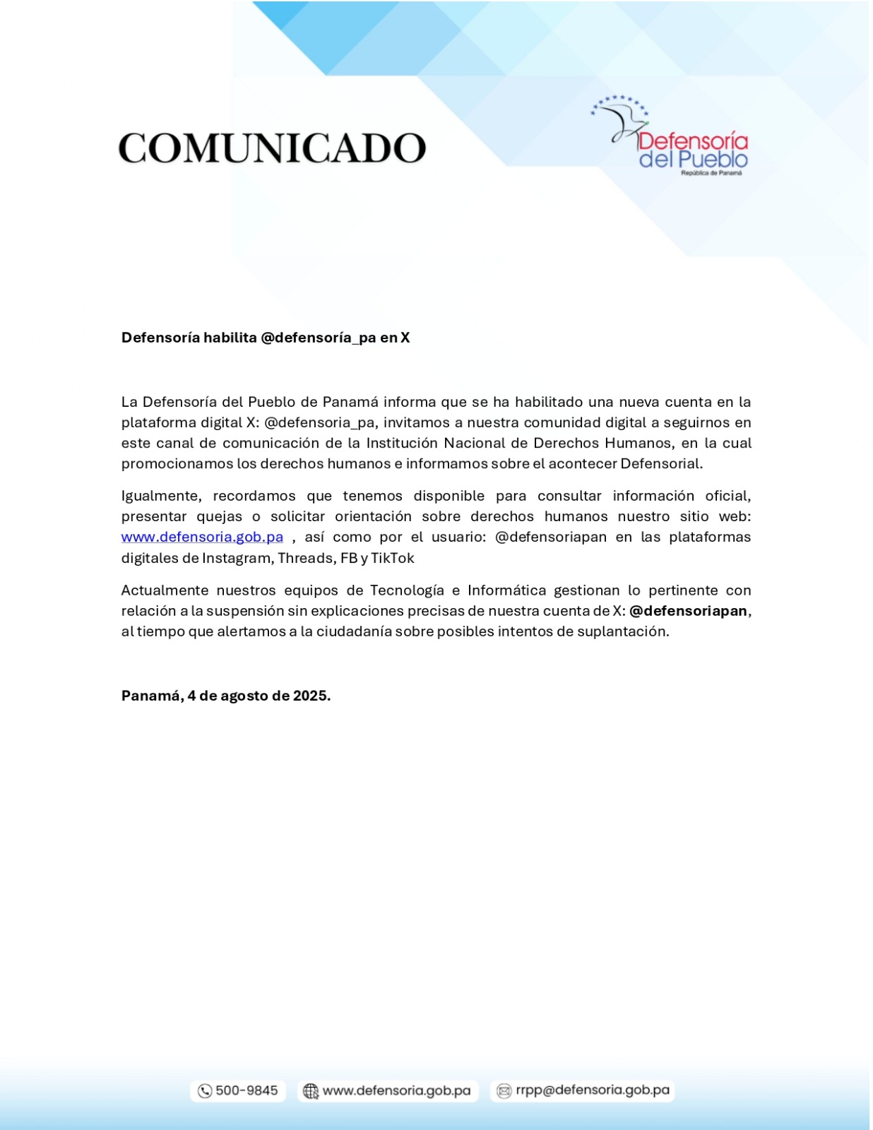 La Defensoría del Pueblo de Panamá informa que se ha habilitado una nueva cuenta en la plataforma digital X: @defensoria_pa , invitamos a nuestra comunidad digital a seguirnos en este canal de comunicación de la Institución Nacional de Derechos Humanos, en la cual promocionamos los derechos humanos e informamos sobre el acontecer Defensorial.