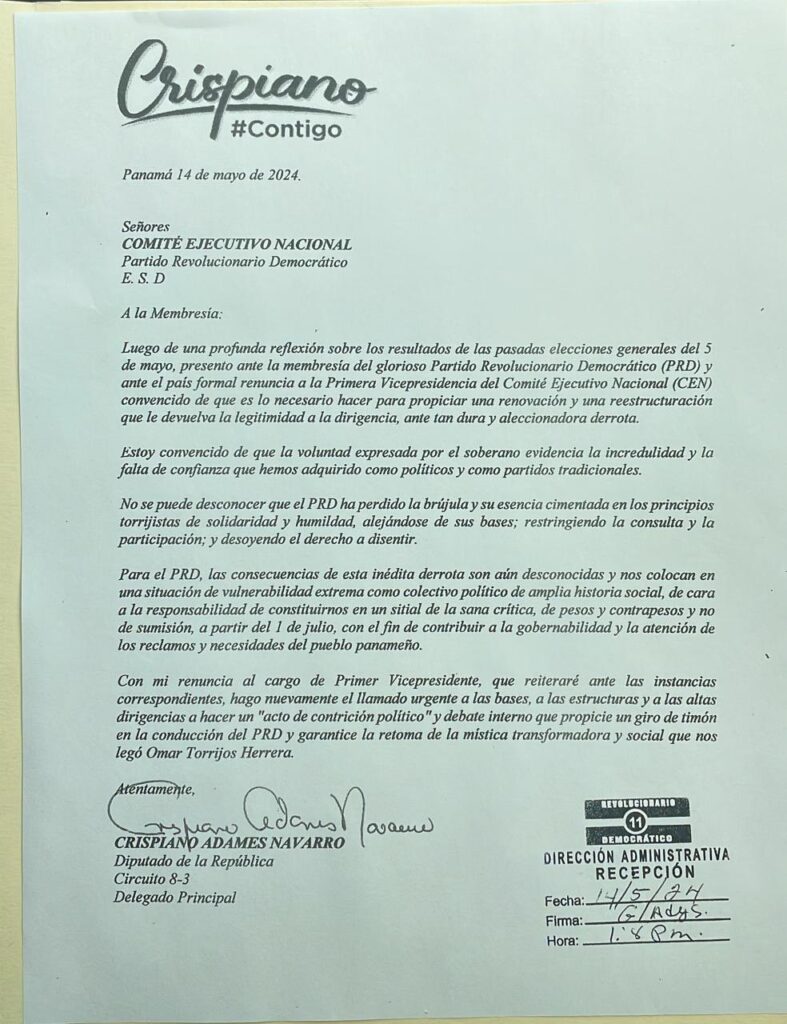 El diputado Crispiano Adames comunicó al país, que luego de una profunda reflexión en las pasadas elecciones generales realizadas el 5 de mayo, decidió presentar ante la membresía del Partido Revolucionario Democrático (PRD) su renuncia a la Primera Vicepresidencia del Comité Ejecutivo Nacional (CEN).