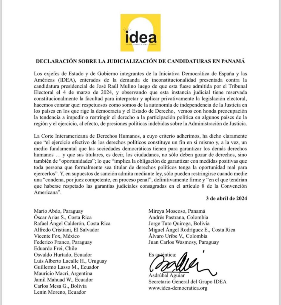 Los exjefes de Estado y de Gobierno integrantes de la Iniciativa Democrática de España y las Américas (IDEA), se pronunciaron ante la demanda de inconstitucionalidad en contra de la candidatura presidencial de José Raúl Mulino.