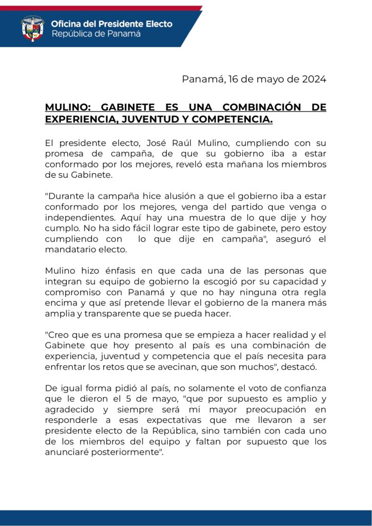 La mañana de este 16 de mayo el presidente electo, José Raúl Mulino, presentó gran parte del Gabinete.