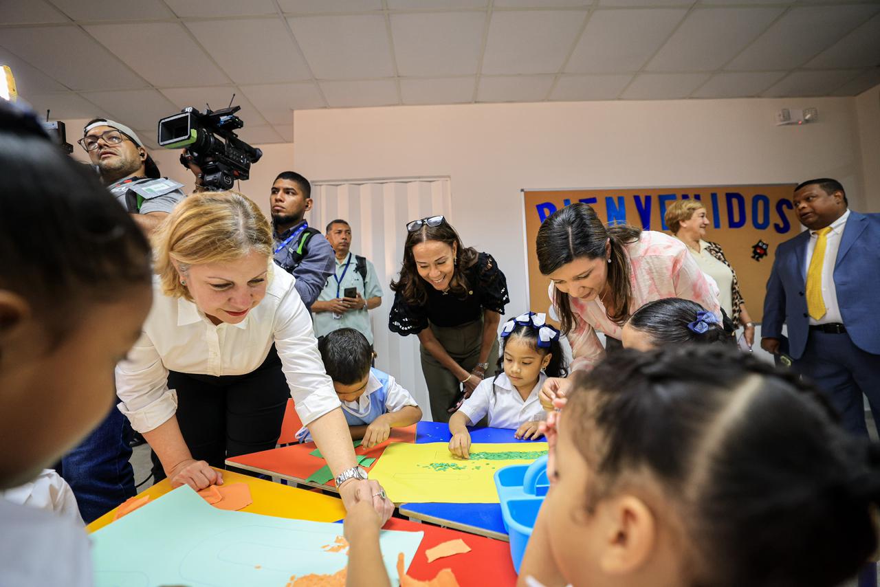 Tras el corte de cinta y la develación de la placa conmemorativa —que resalta que la obra ha sido concluida con el esfuerzo de todos los panameños— el presidente Mulino, junto a la ministra Molinar, la directora de la escuela, Iris Amaya, y toda la comunidad educativa del plantel, recorrió las diferentes aulas recibiendo muestras de afecto de los alumnos.