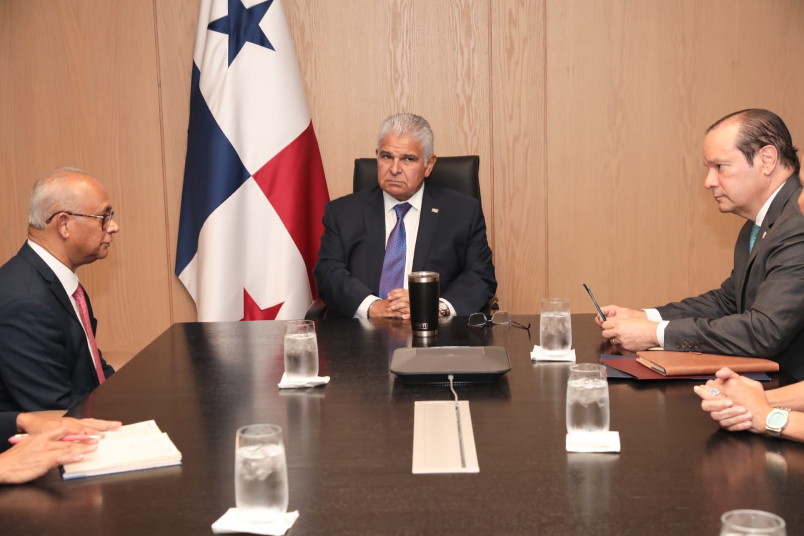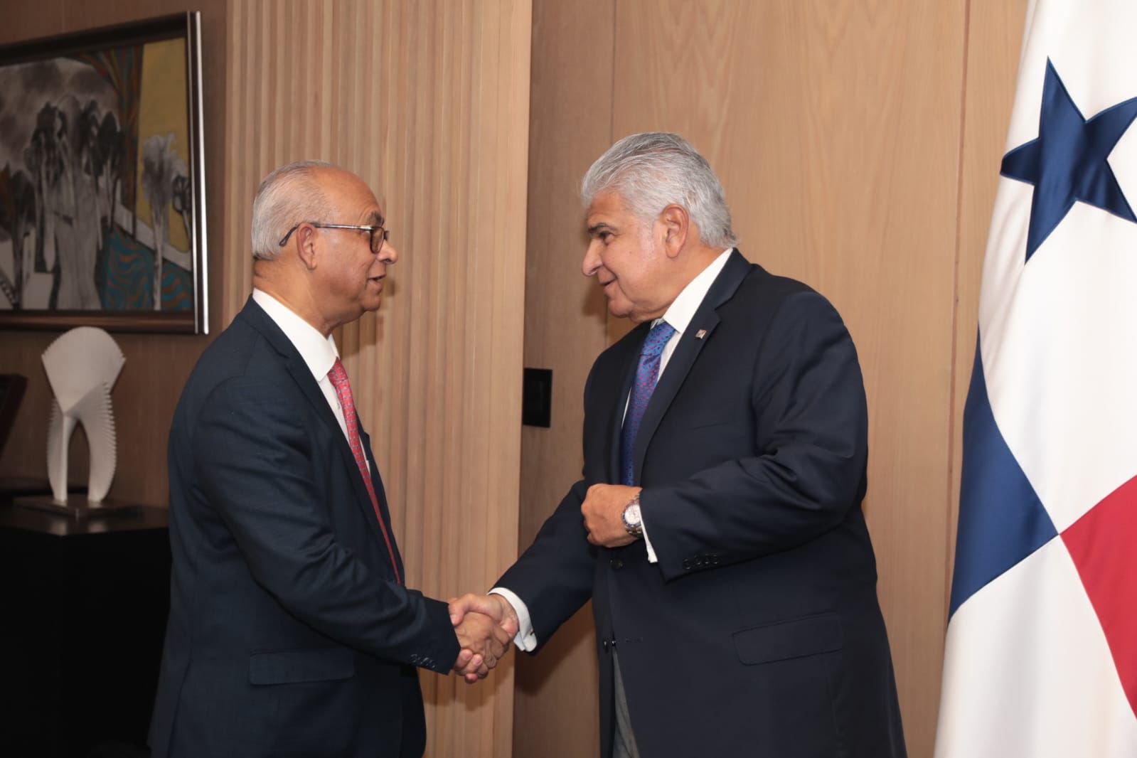 El presidente de la República, José Raúl Mulino, recibió hoy en su despacho al secretario general de la Organización de Estados Americanos (OEA), Albert Ramdin, con quien conversó sobre la situación geopolítica en América y los esfuerzos de este organismo multilateral en defensa de la paz, la prosperidad, la democracia y la no discriminación en la región.