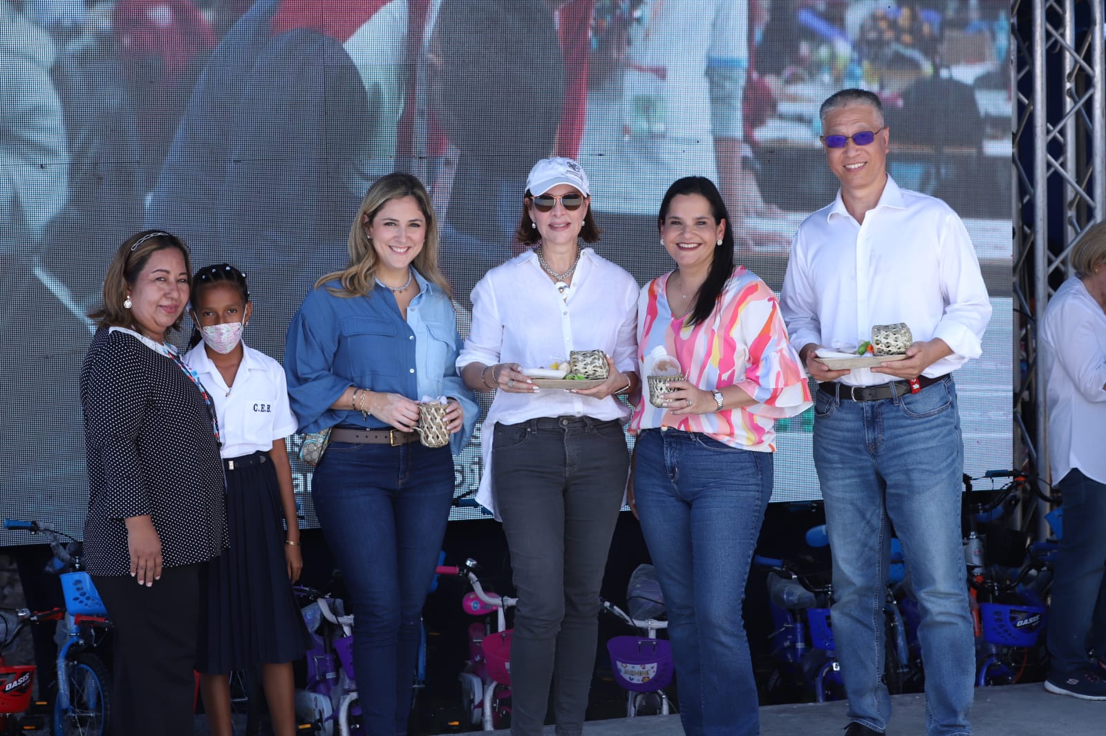 Acompañaron a la primera dama, la esposa del vicepresidente de la República, Julieta Spiegel de Carrizo, la ministra de Desarrollo Social, María Inés Castillo, el Embajador de China en Panamá, Wei Qiang, los directores ejecutivos de Fundesteam y Chess Logistic, Marvin Castillo y Mery Ceballos, respectivamente y autoridades locales.