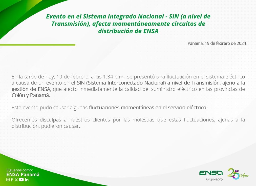 Ensa Panamá comunicó que la tarde de este lunes 19 de febrero a las 1:34 p.m. se presentó una fluctuación en el sistema eléctrico en Panamá y Colón.